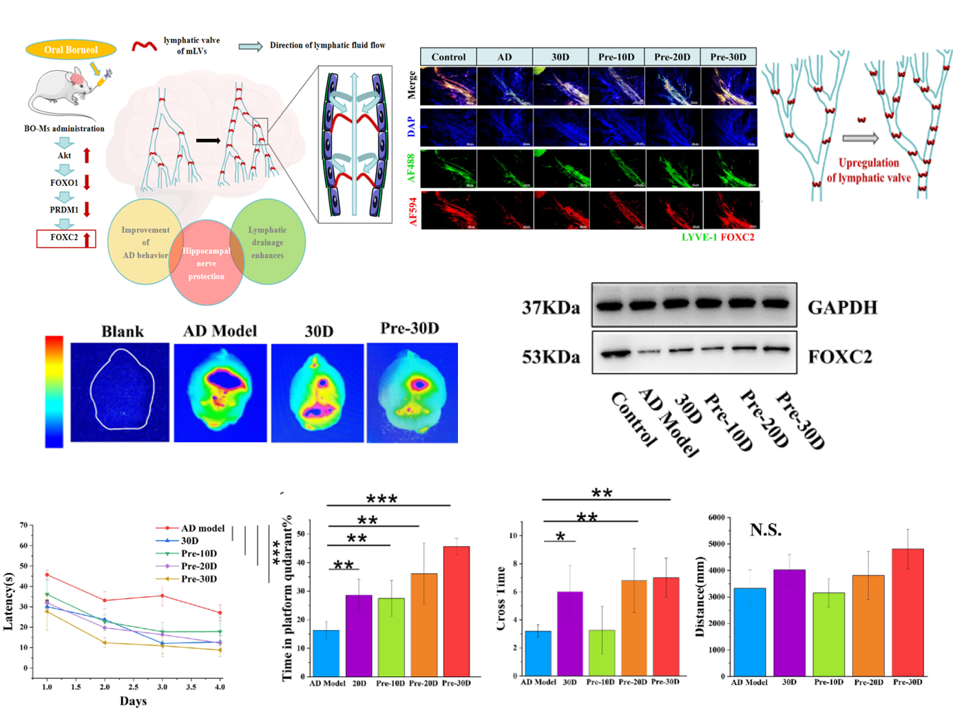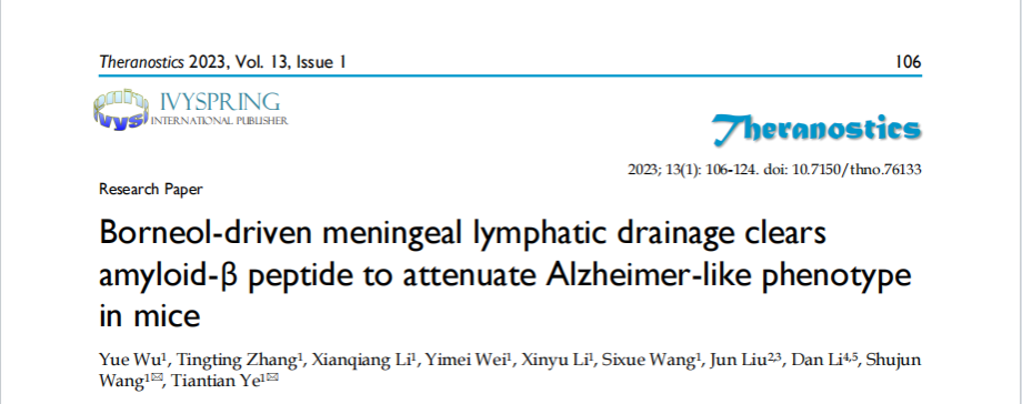 该团队先前研究已经证明了口服纳米冰片胶束(BO-Ms)通过扩张脑膜淋巴管并改善其节律性运动,从而促进Aβ低聚物从脑外排至颈深淋巴结(dCLN),从而促进脑膜淋巴管引流。基于此,在这项研究中,该团队深入研究了冰片调节脑膜淋巴引流的机制,从细胞因子层面证明并解释了冰片促进脑膜淋巴管重建的分子机制,从行为学方面通过水迷宫旷场等实验证明了冰片具有预防性地改善AD小鼠记忆缺陷的能力。该研究的结果强调了BO-Ms在改善脑膜淋巴引流方面的价值,并且基于此项研究,冰片有望补充VEGF-C产生的淋巴管生成不完全、不成熟、无功能的缺陷,通过冰片与VEGF-C的互补优势,提高mlv的成熟度和通透性,增强新生mlv的清除能力。王淑君教授课题组的研究不仅为脑膜淋巴系统的研究就提供了新思路,也为AD的预防提供了新策略。