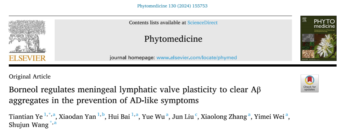 近日,公司WilliamHill中文官方网站王淑君教授课题组继“Borneol-driven meningeal lymphatic drainage clears amyloid-β peptide to attenuate Alzheimer-like phenotype in mice”在Theranostics发表之后,在冰片调节脑膜淋巴瓣可塑性进而清除脑内Aβ聚集体用于缓解阿尔兹海默症(AD)样症状方面研究取得最新进展。该团队通过深入研究,发现了冰片调节脑膜淋巴引流的新机制,冰片通过促进AD模型小鼠背侧脑膜淋巴管(mlv)淋巴瓣的形成,恢复受损mlv的淋巴引流从而提高Aβ42蛋白的淋巴清除率,从根本上对AD早期症状进行预防。相关成果以“Borneol regulates meningeal lymphatic valve plasticity to clear Aβ aggregates in the prevention of AD-like symptoms”为题发表于中药学领域权威期刊Phytomedicine。