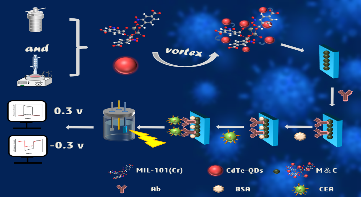 在全世界的非传染性疾病中,癌症是第二大死亡原因。通过量化某些生物标记物来早期诊断癌症可以被视为及时治疗癌症的黄金手段。癌胚抗原(CEA)浓度与结直肠癌,胃癌,肺癌密切相关,已被公认为癌症诊断和预后的广谱生物标记物。通常,CEA在人体中的正常水平低于5.0 ng∙mL-1。一旦超过此浓度范围,可能提示会患有相关癌症的风险。因此,建立一种简单、灵敏的CEA检测方法势在必行。课题组成功地将MIL-101(Cr)与CdTe-QDs进行复合形成M&C异质结,构建了一种新型PEC免疫传感器用于血清和尿液中CEA的检测,应用光电信号强度进行定量分析,并结合3D打印技术设计了小型检测仪的模型。所制备PEC免疫传感器可用于血清和尿液样本中CEA的检测,进一步探讨了其中潜在的“II型”和“Z型”电子传输机制。