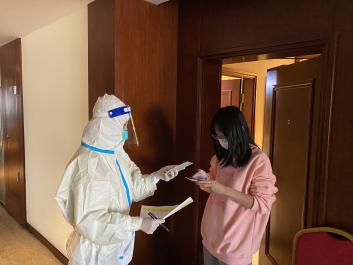 王欣丽老师陪同12月1日批次返校员工在校外酒店进行5天集中健康监测,负责校外健康监测员工的管理与服务工作。