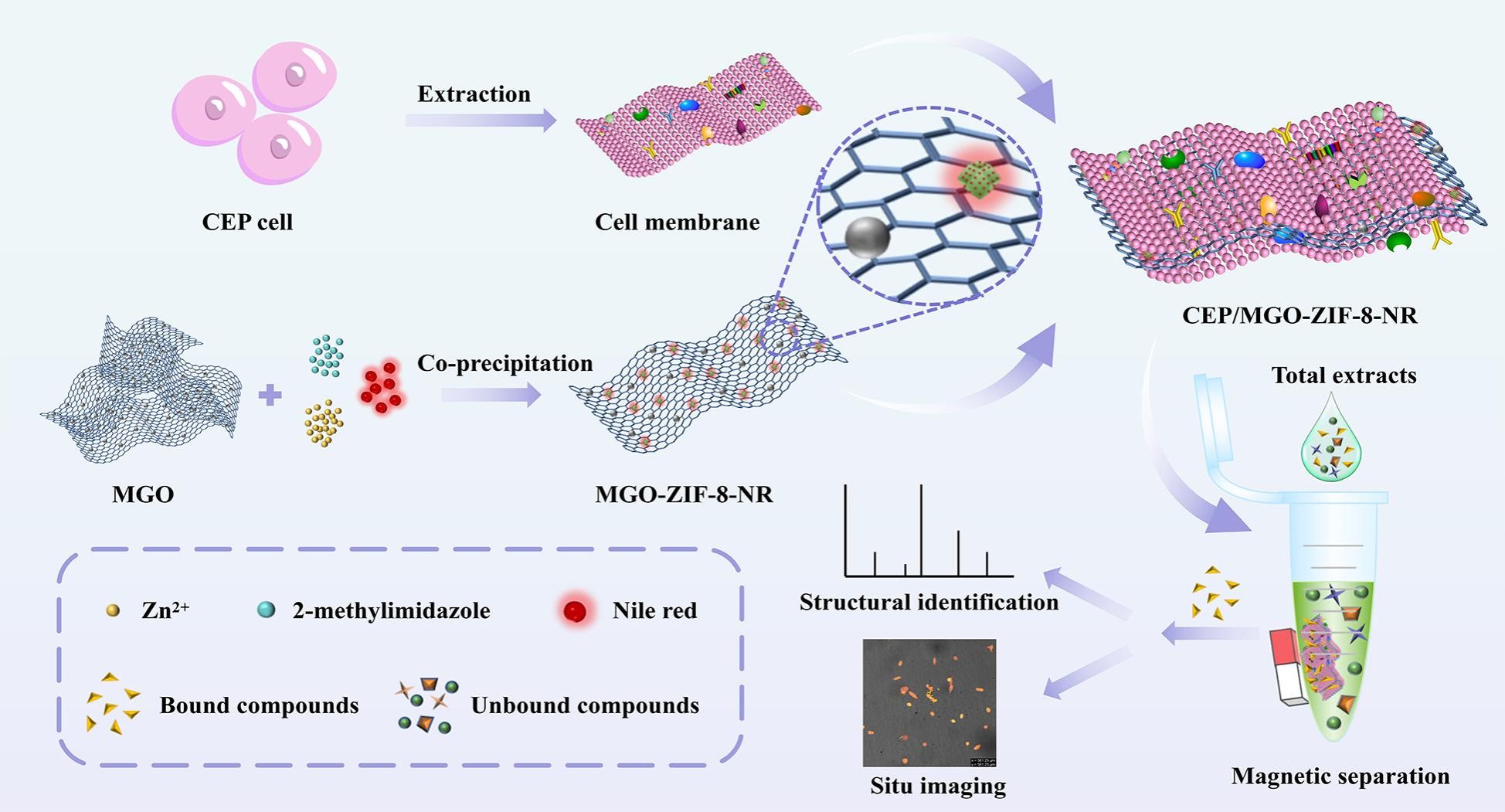 图1 CEP/MGO-ZIF-8-NR的制备及其基于细胞膜固相萃取用于腰痹通胶囊中潜在活性成分筛选的示意图