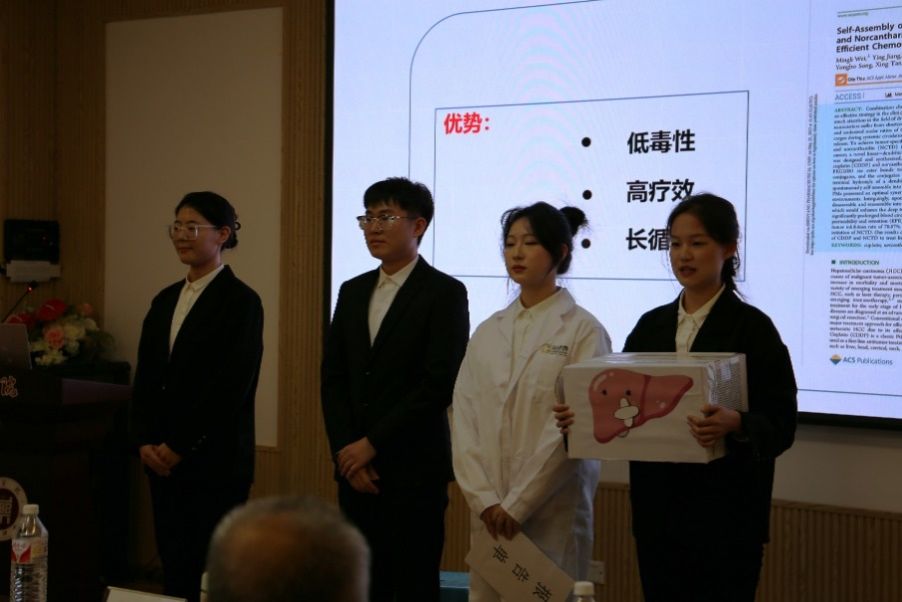 第二组参赛队伍是“加油‘肝’队”,该队的演讲题目是《顺铂和去甲斑蝥素树枝状大分子前药自组装胶束用于肝癌的治疗》。该组选手以医患对话的方式讲述顺铂和去甲斑蝥素树枝状大分子前药自组装胶束在肝癌治疗上的作用,巧妙运用道具为大家介绍肝癌及其新型化疗用药顺铂和去甲斑蝥素注射液,最后提出保护肝脏,从小事做起的呼吁。